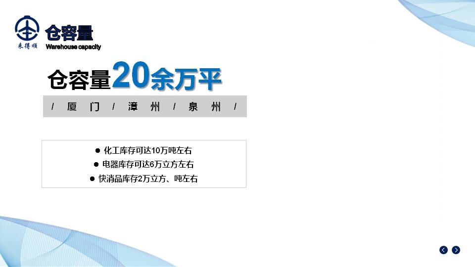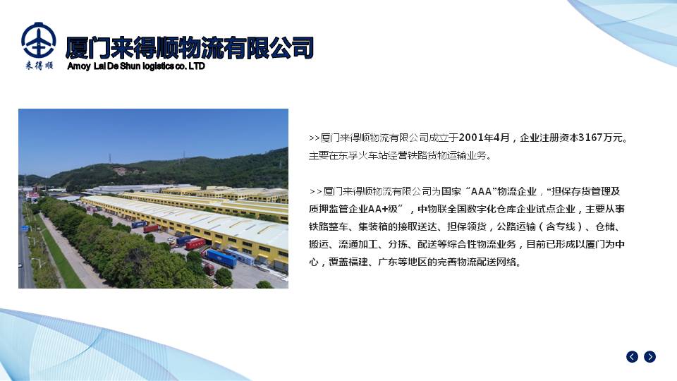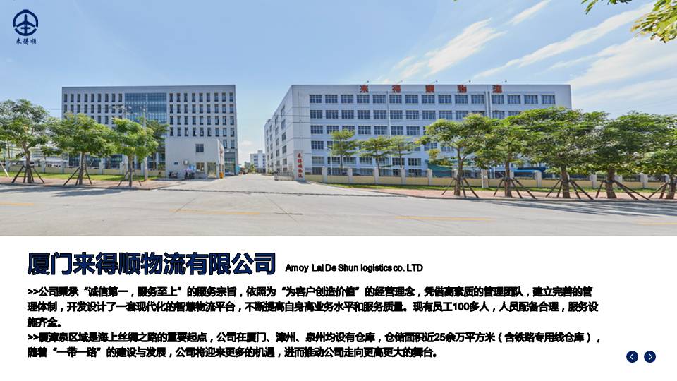 廈門來得順物流有限公司成立于2001年3 月,經(jīng)過多年經(jīng)營(yíng)和發(fā)展,目前公司注冊(cè)資本 達(dá)3167萬元,擁有7個(gè)倉儲(chǔ)庫房,倉儲(chǔ)面積達(dá)25萬平,員工隊(duì)伍120多人,,主要從事鐵路整車、集裝箱的接取送達(dá)、擔(dān)保領(lǐng)貨,公路運(yùn)輸(含專線)、倉儲(chǔ)、搬運(yùn)、流通加工、分揀、配送等綜合性物流業(yè)務(wù),目前已形成以廈門為中心,覆蓋福建、廣東等地區(qū)的完善物流配送網(wǎng)絡(luò)。公司為國(guó)家“AAA”物流企業(yè),是“廈門市物流協(xié)會(huì)副會(huì)長(zhǎng)單位”, “擔(dān)保存貨管理及質(zhì)押監(jiān)管企業(yè)AA+級(jí)”,中物聯(lián)全國(guó)數(shù)字化倉庫企業(yè)試點(diǎn)企業(yè),榮獲“廈門市市級(jí)高新技術(shù)企業(yè)”稱號(hào)。