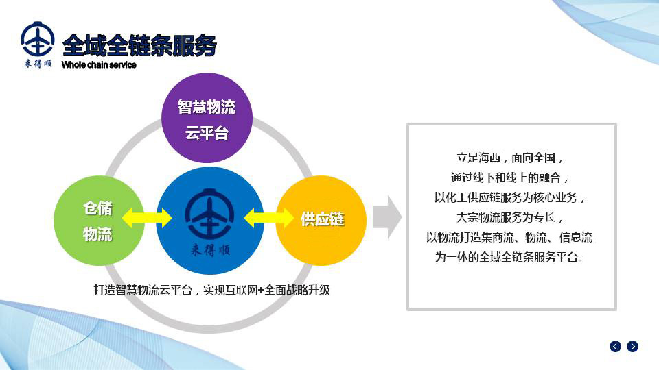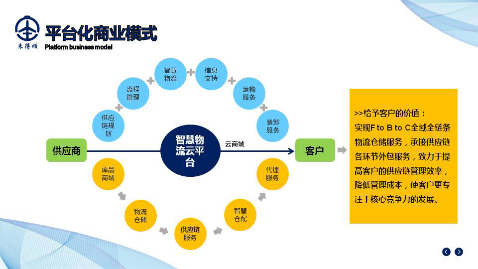 公司秉承“誠(chéng)信第一,服務(wù)至上”的服務(wù)宗旨,依照為“為客戶創(chuàng)造價(jià)值”的經(jīng)營(yíng)理念,憑借高素質(zhì)的管理團(tuán)隊(duì),建立完善的管理體制,開發(fā)設(shè)計(jì)了一套現(xiàn)代化的智慧物流平臺(tái),不斷提高自身高業(yè)務(wù)水平和服務(wù)質(zhì)量。在化工、家電、快消品行業(yè)的倉儲(chǔ)業(yè)務(wù)已成為福建行業(yè)的佼佼者,并長(zhǎng)期與中國(guó)石油、中國(guó)石化、中國(guó)神化、中煤能源、海爾電器、格力電器等知名品牌的公司合作,在鐵路運(yùn)輸領(lǐng)域更是擁有深厚和豐富的資源,隨著物聯(lián)網(wǎng)技術(shù)的發(fā)展,公司先期開發(fā)的倉配管理系統(tǒng),以傳統(tǒng)ERP思路為基礎(chǔ)實(shí)現(xiàn)對(duì)公司物流倉儲(chǔ)、配送業(yè)務(wù)的管理。隨著企業(yè)互聯(lián)網(wǎng)+時(shí)代的到來,公司進(jìn)行戰(zhàn)略轉(zhuǎn)型,意在匯集社會(huì)上中小物流公司的資源于平臺(tái)上,為F to B to C形成一個(gè)全鏈條的物流服務(wù)中心。公司借此將物流服務(wù)延伸致物流全鏈條、結(jié)合物流電商一體化的行業(yè)發(fā)展方向,寄希望在現(xiàn)有系統(tǒng)的基礎(chǔ)上正在努力打造新一代智慧物流與電商相結(jié)合的云平臺(tái),實(shí)現(xiàn)F TO C(Factory to Customer)B to B(Bussiness to Bussiness) 、B to C(Bussiness to Customer)商業(yè)服務(wù)模式,同時(shí)還提供倉品電商等服務(wù)模塊,要通過這個(gè)智慧云平臺(tái)實(shí)現(xiàn)生產(chǎn)廠家到終端客戶的端到端一體化服務(wù)平臺(tái),無論是物流業(yè)務(wù)提供商,還是廠家、分銷商、渠道商、終端客戶都能實(shí)現(xiàn)一站式在平臺(tái)內(nèi)解決商品交易及全流通的需求,即完成本企業(yè)電子商務(wù)。。